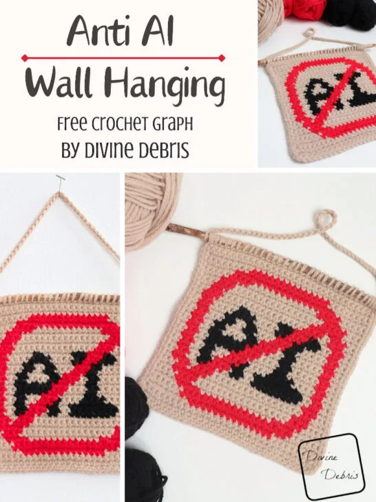 Hi there! What can I say about this week’s pattern? It pretty much speaks for itself, doesn’t it? Of all the very “political” designs I want to be making right now, this one was the fastest and easiest to work up – the Anti AI Wall Hanging pattern. I actually mocked up this design back …