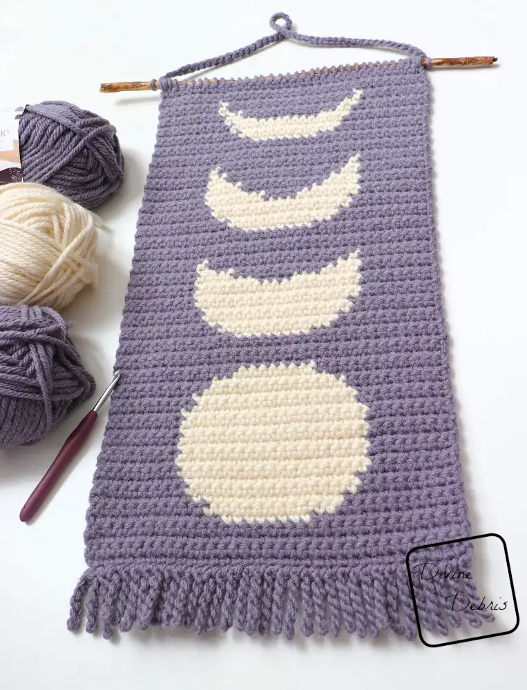 ![[Image description] Top down look at an unfinished version of the Simple Moon Phase Wall Hanging with skeins of yarn along the top of the photo and a white woman's hand holding the bottom left corner.](https://d3gel9wqxksnxm.cloudfront.net/wp-content/uploads/2025/12/SimpleMoonPhaseWallHanging-767x1000-1.jpg.webp)
