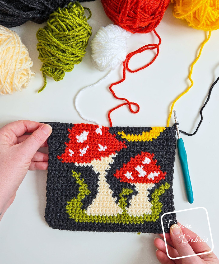 Like nearly all my other wall hanging patterns, the Mystical Mushrooms Wall Hanging is worked from the bottom up in rows of single crochet stitches. Using Stitch Fiddle I designed this pattern as a tapestry/ intarsia project for people to customize as you’d like with colors in your stash. While I worked mine, I used a combination of techniques – I used separate skeins of color for the individual sections of color (picking them up and dropping them down the WS when not in use) and then crocheted over some spots (like the white spots on the mushrooms) where the space was small enough. If you decide use bobbins for color work like this, be sure to work back and forth and not in a circle to try to keep the yarn from getting too tangled – here’s a video on Instagram showing what I mean.
