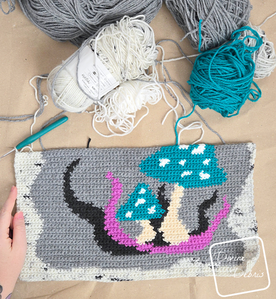Like nearly all my other wall hanging patterns, the Wild Mushrooms Wall Hanging is worked from the bottom up in rows of single crochet stitches. Using Stitch Fiddle I designed this pattern and this is a great stash buster (or at least was for me). I used a combination of 2 different brands, Brava Worsted and Pound of Love, to create the effect and really leaned into the bright vibrant of Brava Worsted for the pop of the teal and purple in the design. I crocheted this design in back and forth rows, with a turn at the beginning of the row. If you’re like me and you use bobbin’s for color work like this, be sure to work back and forth and not in a circle to try to keep the yarn from getting too tangled – here’s a video on Instagram showing what I mean.